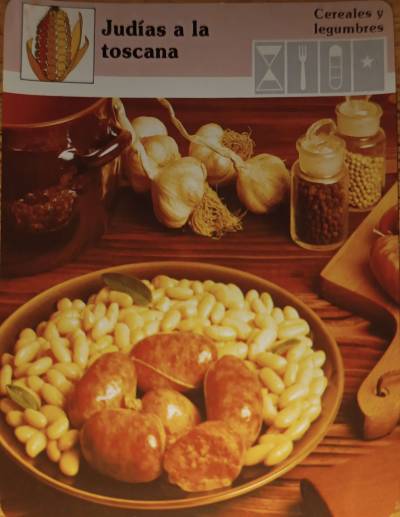 Las judías (preferiblemente de las llamadas «de riñón», suaves y cremosas) habrán estado en remojo unas horas antes de hacer el guiso. Se ponen en una cacerola cubiertas de agua fría y se dejan cocer suavemente hasta que estén tiernas.
