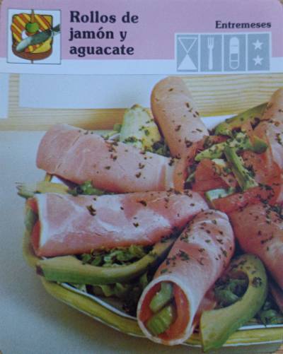 Se reparte esta mezcla entre las lonchas de jamón, que se enrollan, y se van disponiendo en una fuente adornadas con el aguacate restante y el perejil picado.
