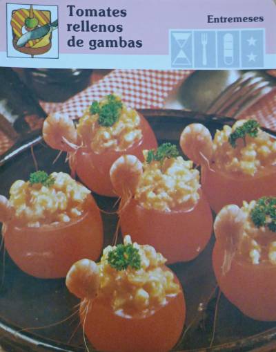 La patata se pica en cuadraditos muy finos. Los tomates se vacían. La pulpa se pica también y se aliña en un poco del caldo donde cocieron las gambas. Se mezcla con éstas el picadillo y se añade la mayonesa. Se rellenan los tomates, que deben estar escurridos y sin pipas. Se adornan, si se quiere, con algunas quisquillas y con perejil.